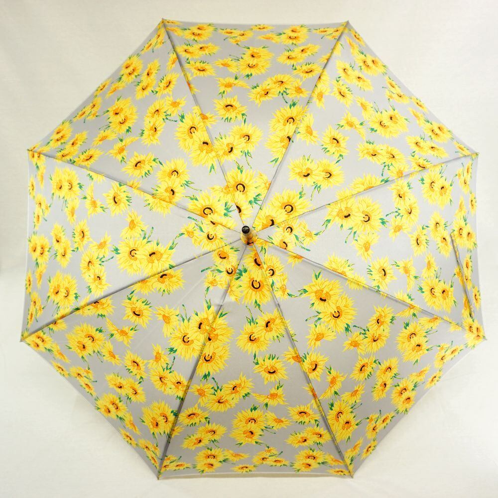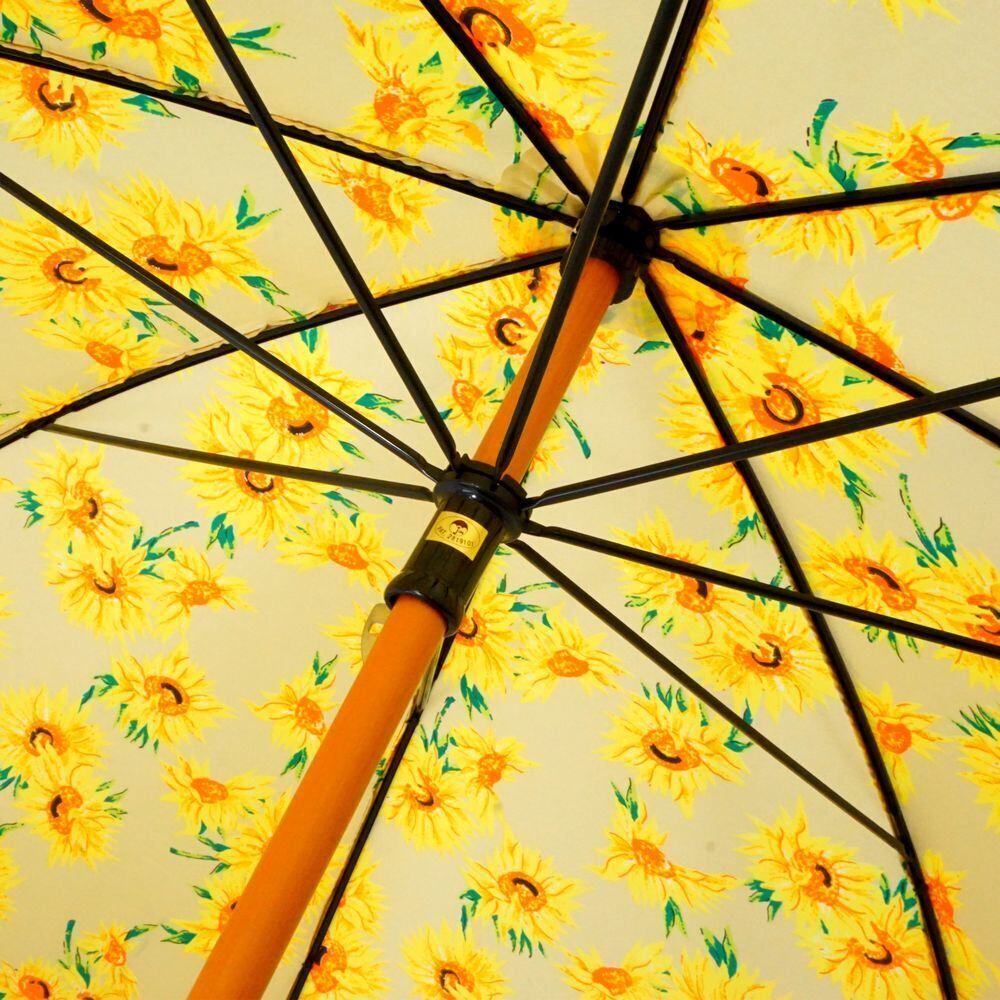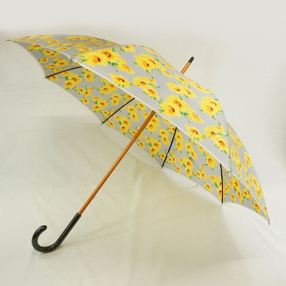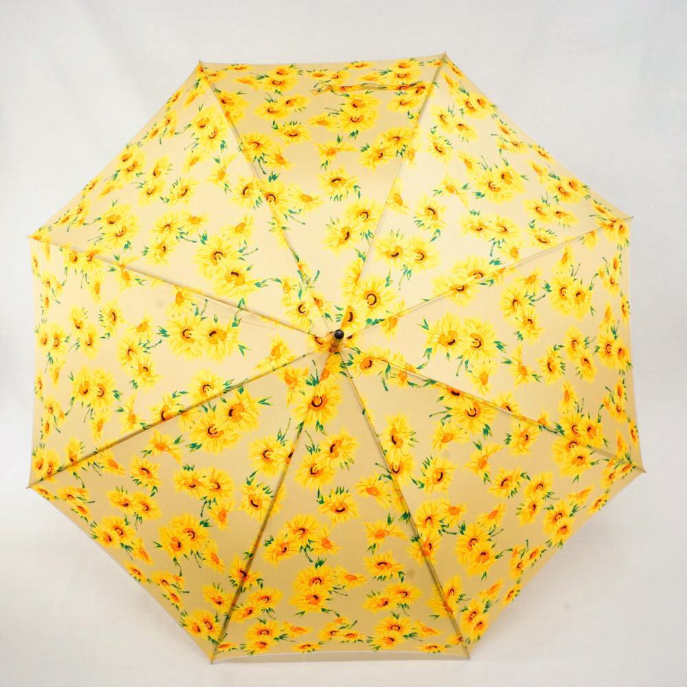 ひまわり柄を全体にプリントした木棒手開き長傘です。