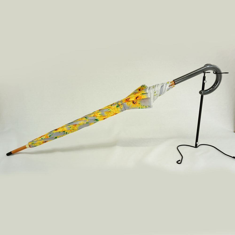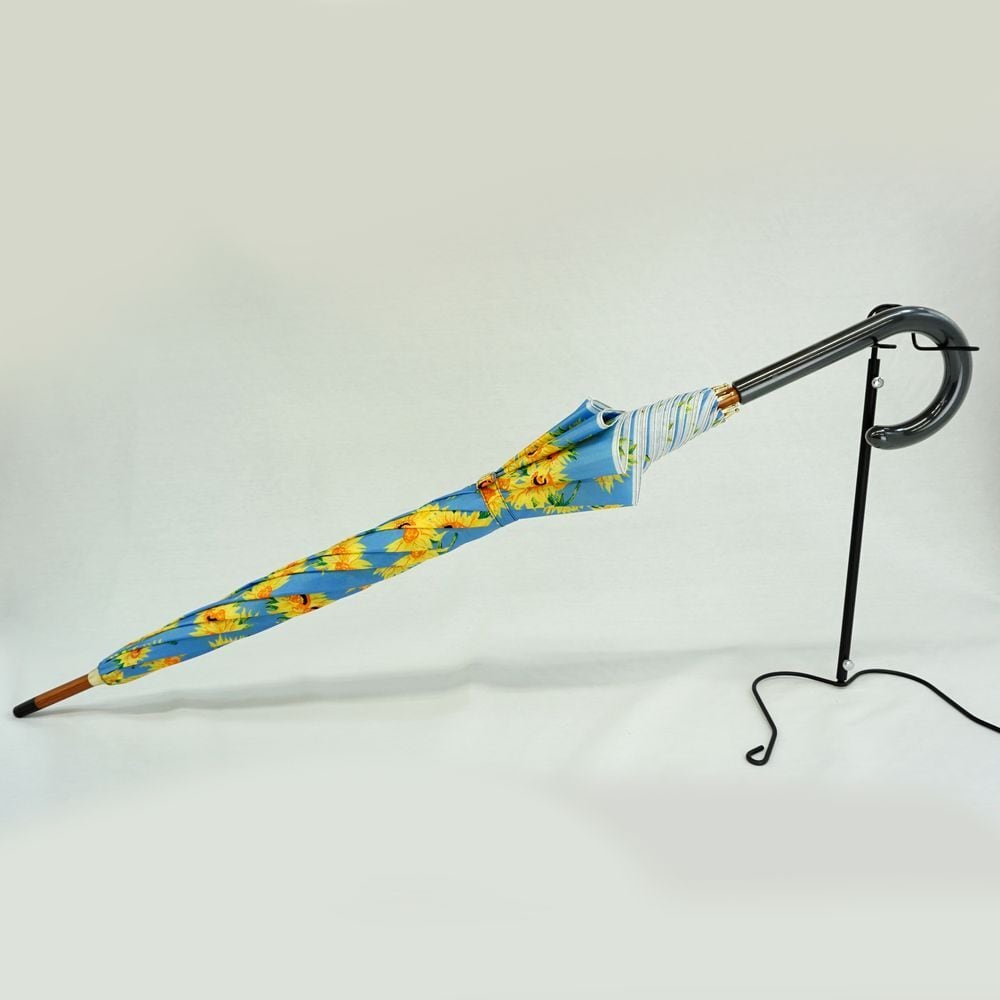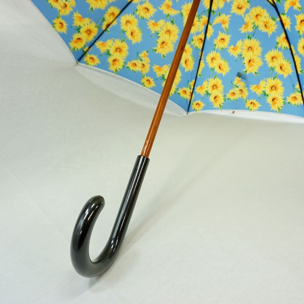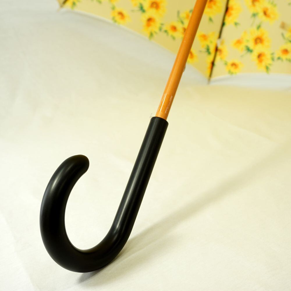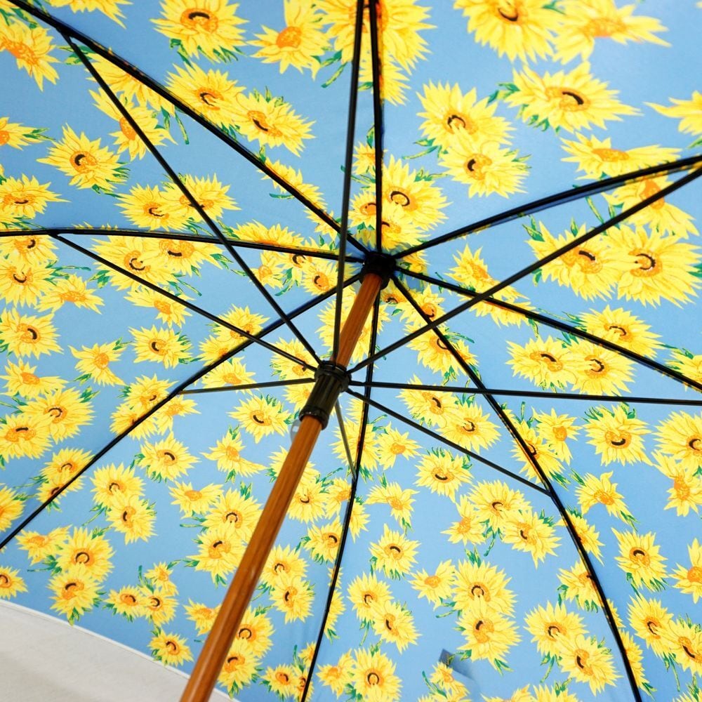 ひまわり柄を全体にプリントした木棒手開き長傘です。
