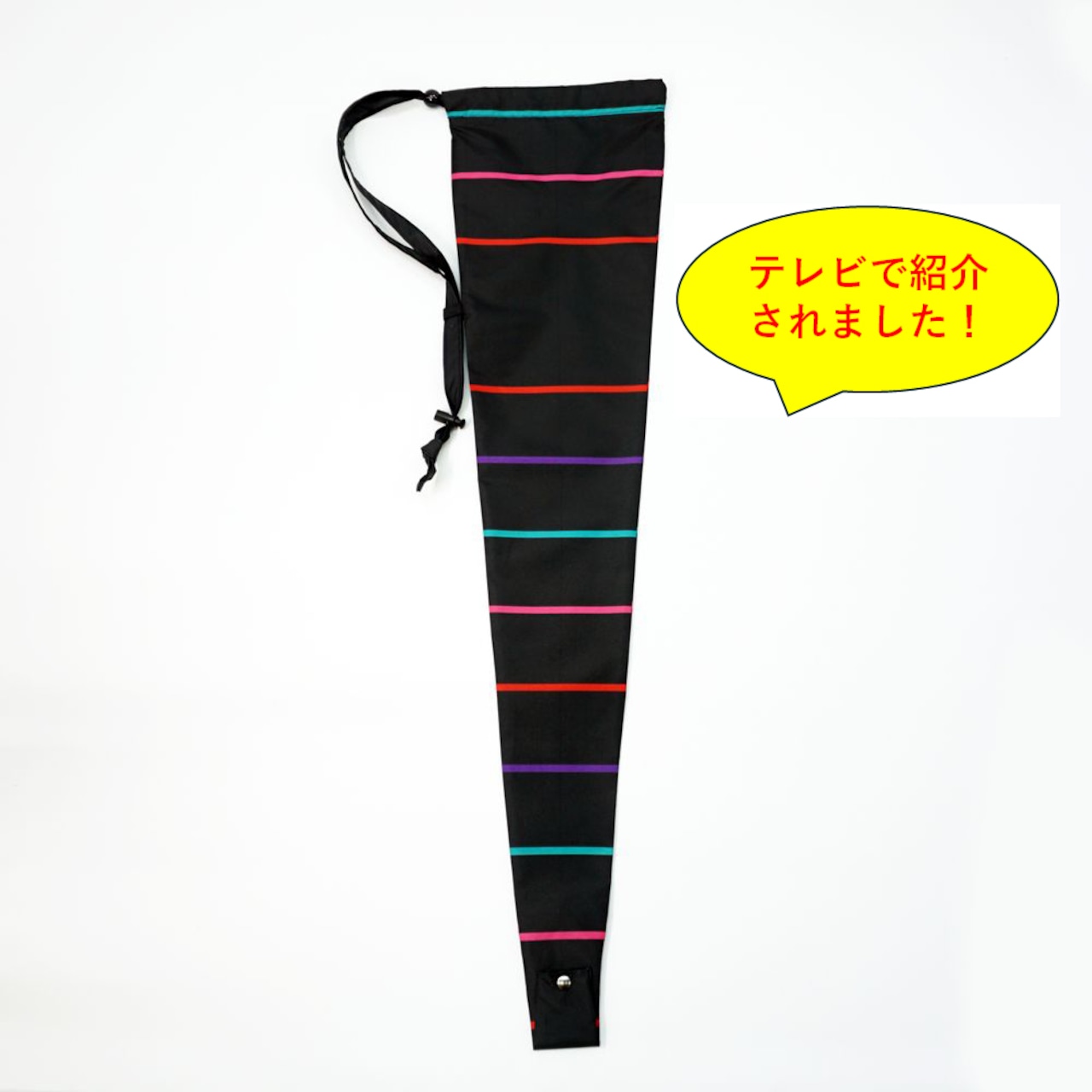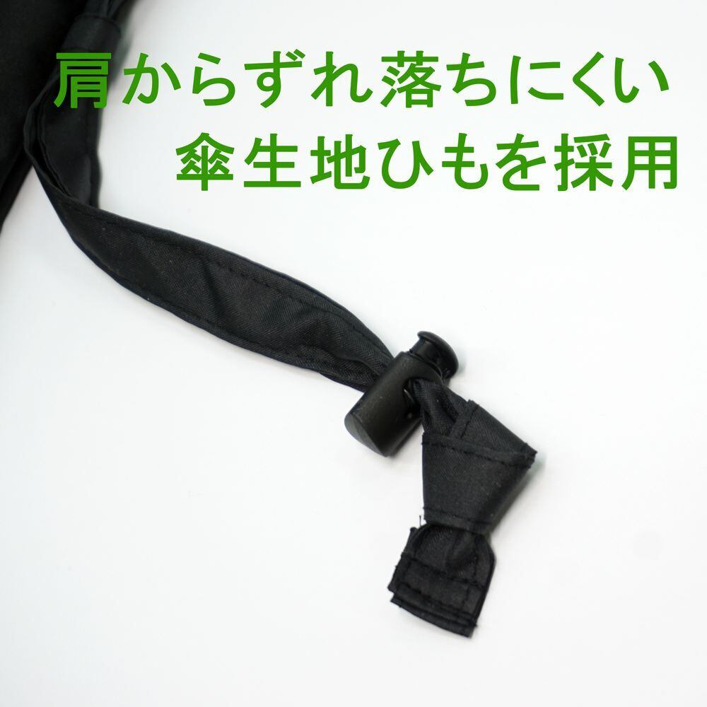 雨の日は、服や荷物などが濡れないように長傘の収納が大変です。レインポケット雫長は、長傘を肩にけて移動できます。ボタンを外すとあ雨水を抜くことができます。防水コーテイング傘生地の傘ひもが肩にフイットしてずれにくくなっています。重さもわずか25g、折りたたんでポケットに入れれます。雨の日の出張やお出かけにいつもバックに入れておきたい逸品です。